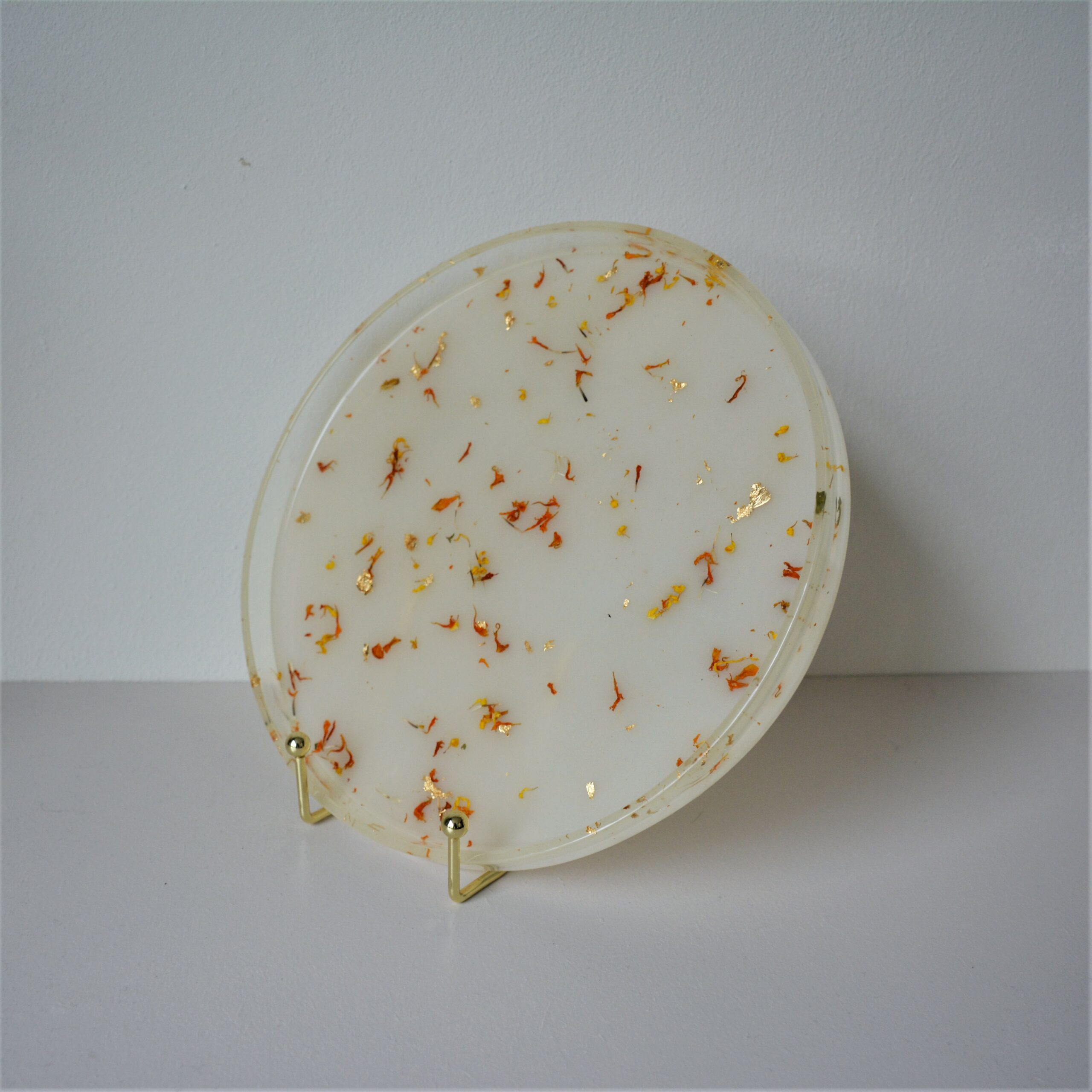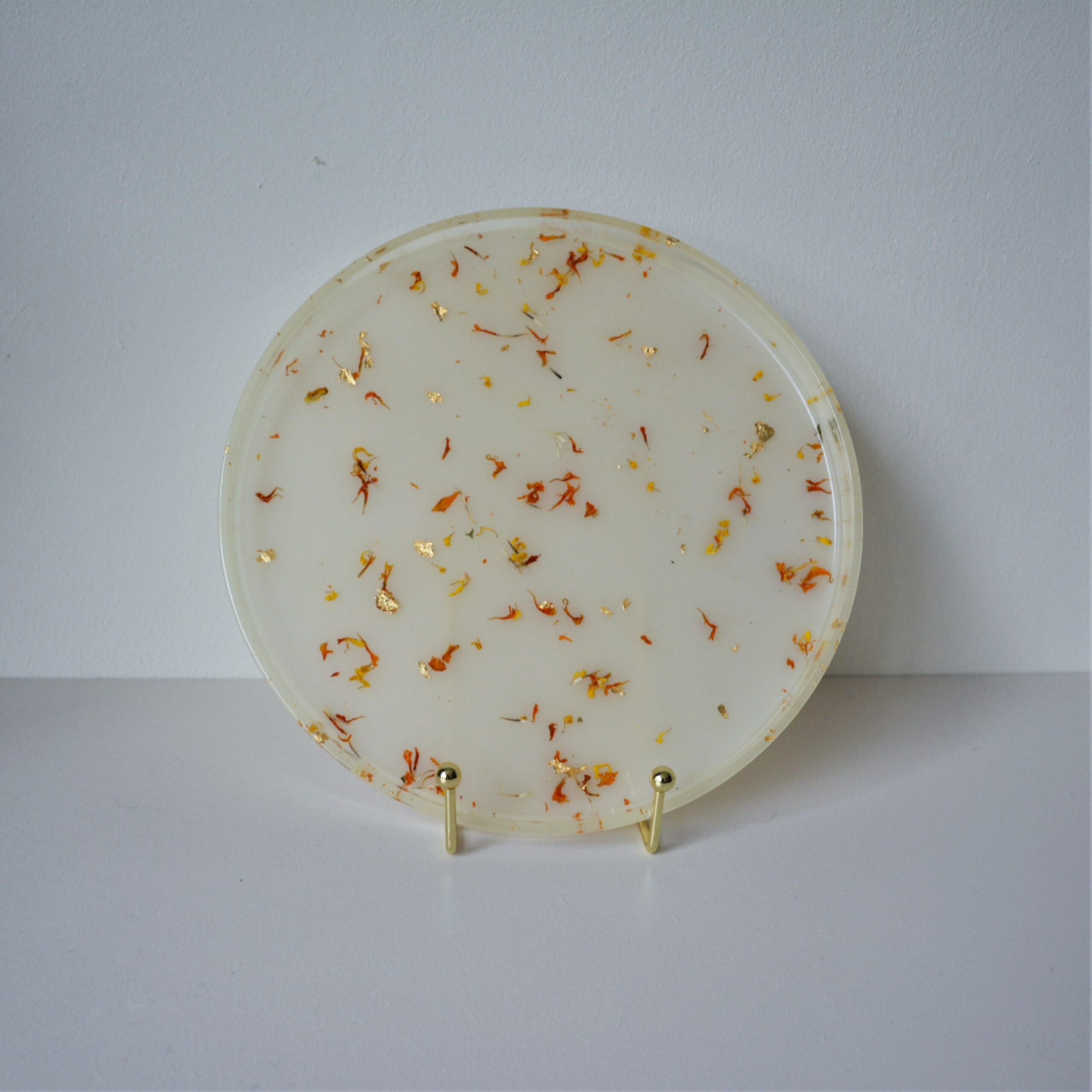 dienblad van epoxy met bladgoud bloesem uit eigen tuin